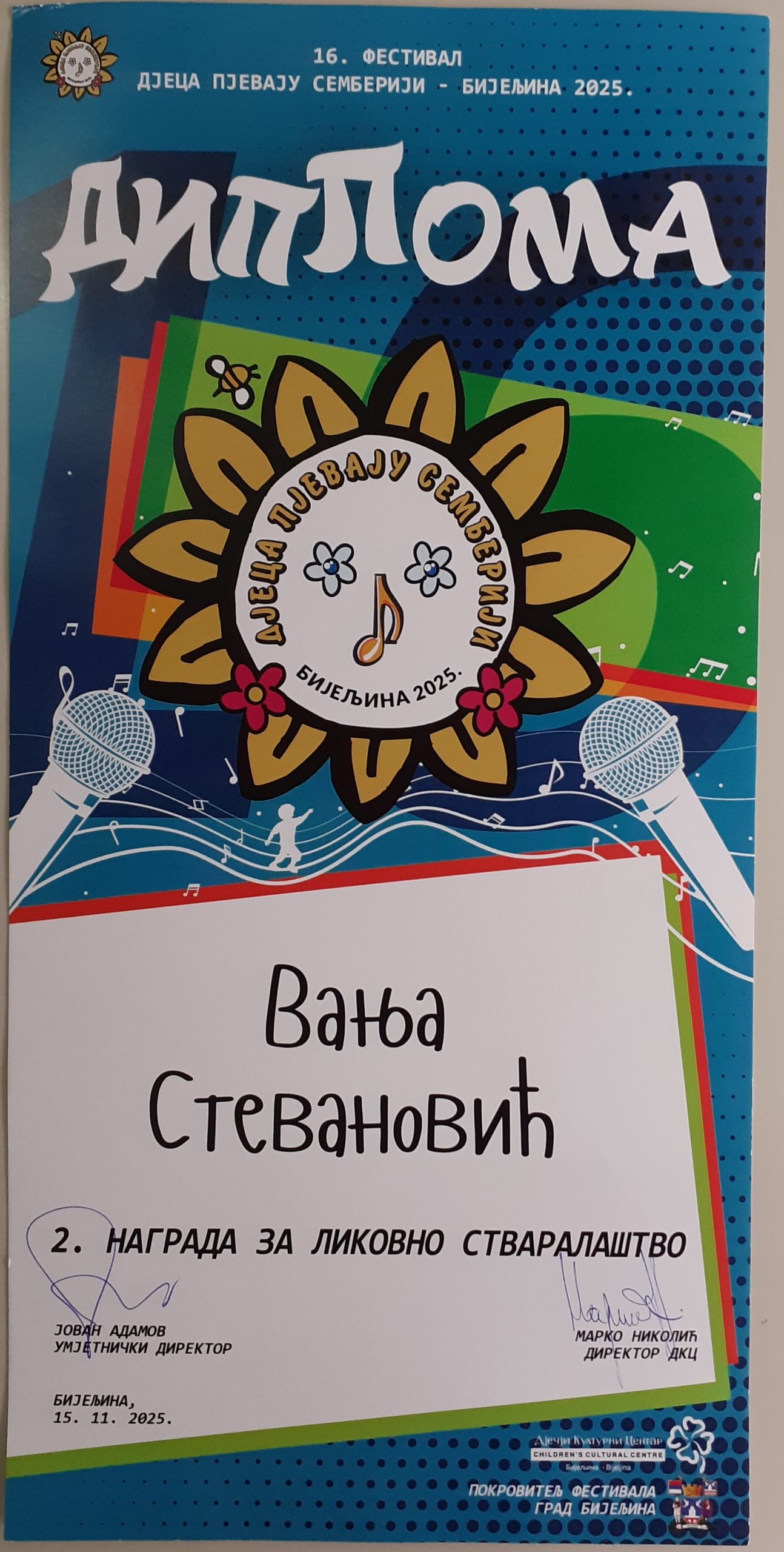 Дана, 15. 11. 2025. године на Фестивалу „Дјеца пјевају Семберији“ у Бијељини, у категорији ликовног стваралаштва, 2. награду је освојила ученица Вања Стевановић I-1; учитељица Весна Латиновић.